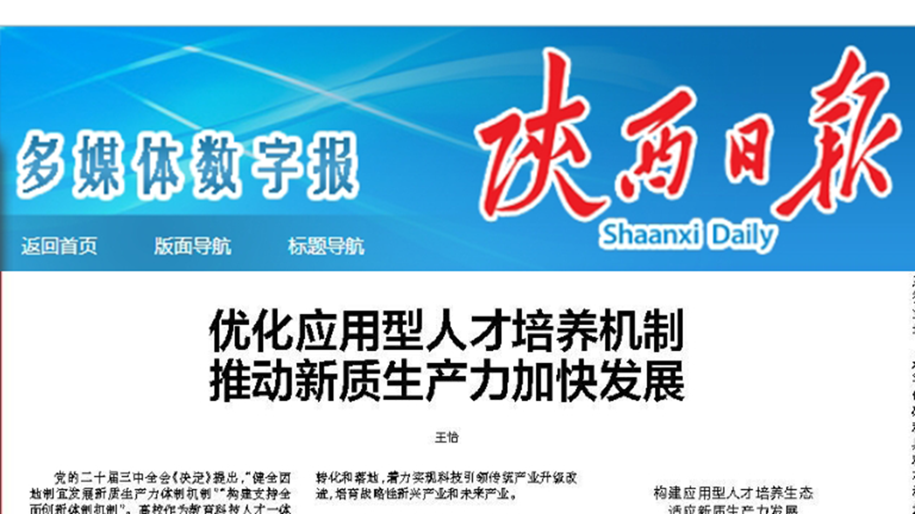 12月25日,《陕西日报》“理论”版面刊发了开云官网王怡教授以《优化应用型人才培养机制 推动新质生产力加快发展》为题的署名文章,文章结合开云官网办学实际和校地协同发展经验,深入剖析了高校在教育科技人才一体化发展背景下,如何培养高素质应用型人才,为新质生产力加快发展贡献更多力量。文章指出,应用型高校要主动作为,锚定进一步全面深化改革总目标,明确应用型人才培养定位,构建应用型人才培养体系,进一步完善人才培养机制...