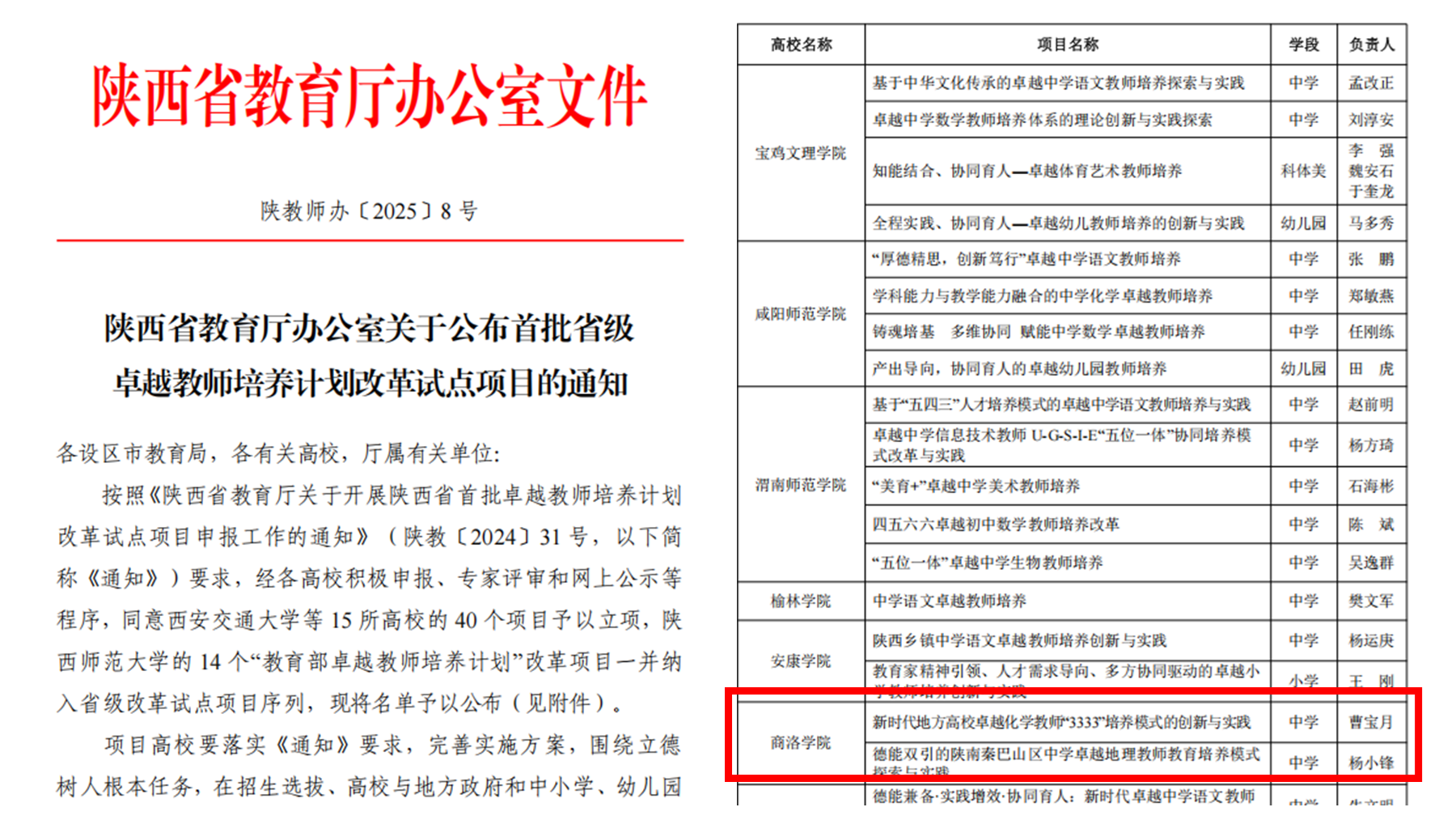 近日,陕西省教育厅办公室公布了首批省级卓越教师培养计划改革试点项目名单。开云官网曹宝月教授主持的《新时代地方高校卓越化学教师“3333”培养模式的创新与实践》和杨小锋博士主持的《德能双引的陕南秦巴山区中学卓越地理教师教育培养模式探索与实践》两个项目获批立项。学校将以实施卓越教师培养计划改革试点项目为契机,持续加强师范专业内涵建设,深化教育教学改革,全面提升师范教育教学水平,助力学校师范专业认证相关工作...