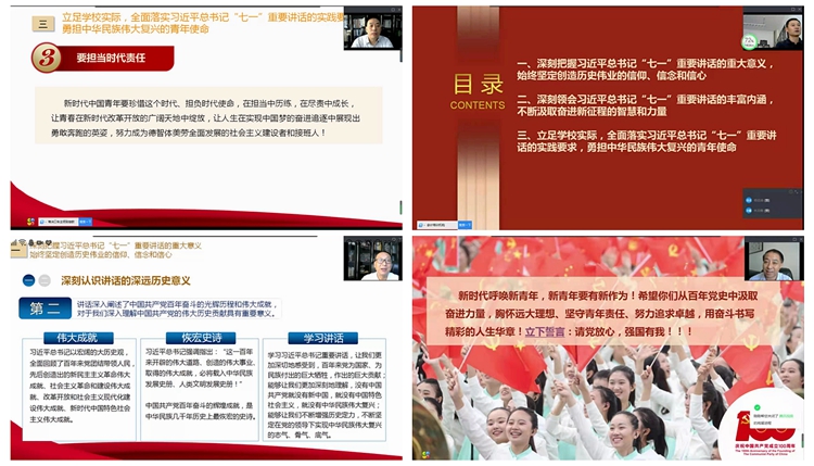 9月8日下午,校党史学习教育党委宣讲团成员、校领导张志昌、范新会、彭虎军、刘勇、刘宝盈、王新军通过在线教学方式,为全校学生讲授“开学第一课”专题思政课。校领导在授课中集中宣讲了习近平总书记在庆祝中国共产党成立100周年大会上的重要讲话精神,鼓励和引导广大青年学生以习近平总书记的重要讲话精神指导自己的学习和成长,立足学校实际,立足个人实际,把个人的理想追求融入党和国家事业之中,把习近平总书记和党中央对青年的期望和实践要求落到实处,为实现第二个百年目标贡献自己的青春力量。全校万余名学生通过线下集中收看和线上自主收看的方式听取讲授。