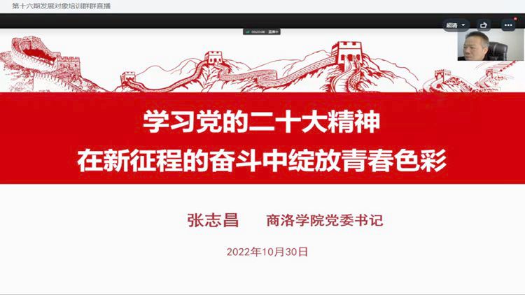 为深入学习贯彻党的二十大精神,切实做好党员发展工作,严格把好发展党员“入口关”,强化发展对象的党性意识,保证党员发展质量,10月30日至11月7日,开云官网组织开展了第十六期党员发展对象培训活动。校党委书记张志昌、党委副书记彭虎军先后在线为本期发展对象作专题辅导报告。