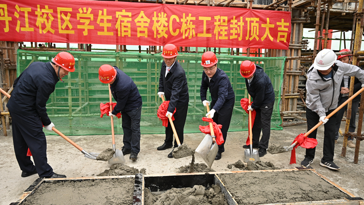 在热烈的掌声中,张志昌宣布丹江校区学生宿舍楼C栋楼顺利封顶。校领导和与会嘉宾铲起混凝土为项目封顶,共同见证了本项目最后一块混凝土板的浇筑过程。