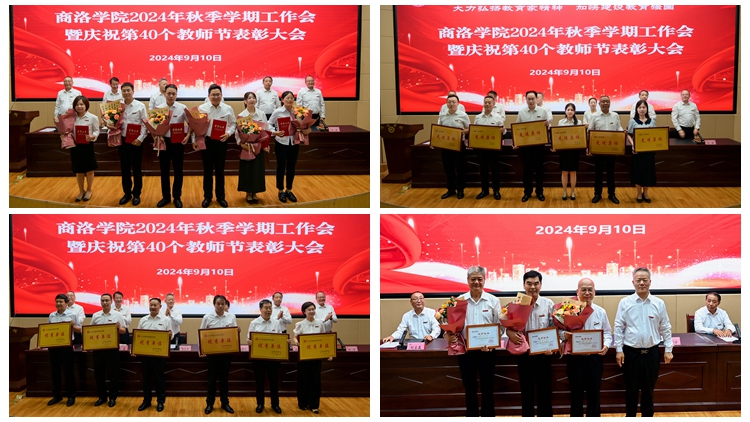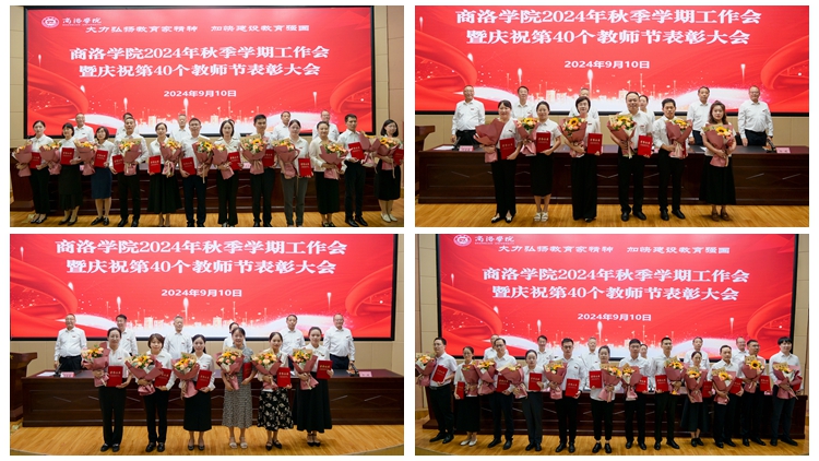 大会对光荣从教40年教师、学校2023年度目标责任考核优秀单位、学校2024年先进集体、2023年度全省教育系统先进个人、学校2024年优秀教师和优秀教育工作者,以及一年来在教学、科研、学生工作中取得突出业绩的教师进行了表彰。校领导为受表彰集体和个人颁发奖牌和荣誉证书,学生代表上台为获奖教师献花。