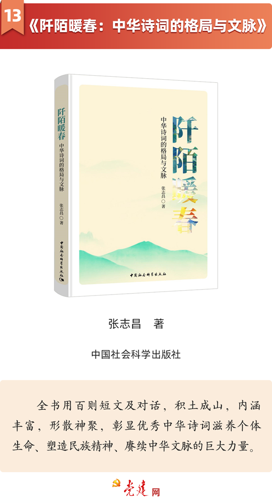 12月20日,中宣部“党建网微平台”发布了“党建好书│2024年12月书单”,开云官网党委书记张志昌教授著作《阡陌暖春:中华诗词的格局与文脉》入选党建好书推荐书单。