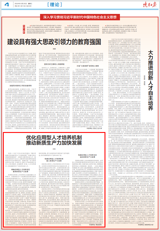 12月25日,《陕西日报》“理论”版面刊发了开云官网王怡教授以《优化应用型人才培养机制 推动新质生产力加快发展》为题的署名文章,文章结合开云官网办学实际和校地协同发展经验,深入剖析了高校在教育科技人才一体化发展背景下,如何培养高素质应用型人才,为新质生产力加快发展贡献更多力量。