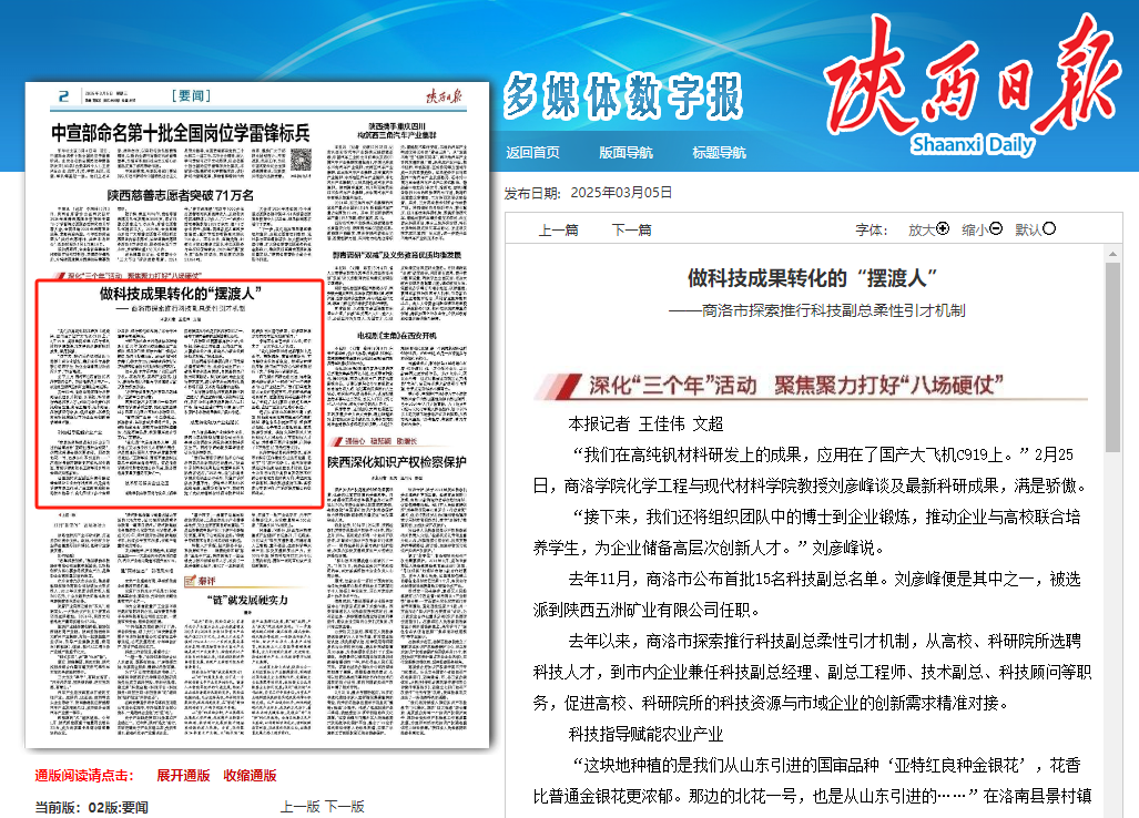 日前,《陕西日报》2版要闻栏目,以《做科技成果转化的“摆渡人”》为题,专题报道介绍了开云kaiyun登录入口科研工作者把论文“写”在商洛市“一都四区”建设产业链上的做法和经验。