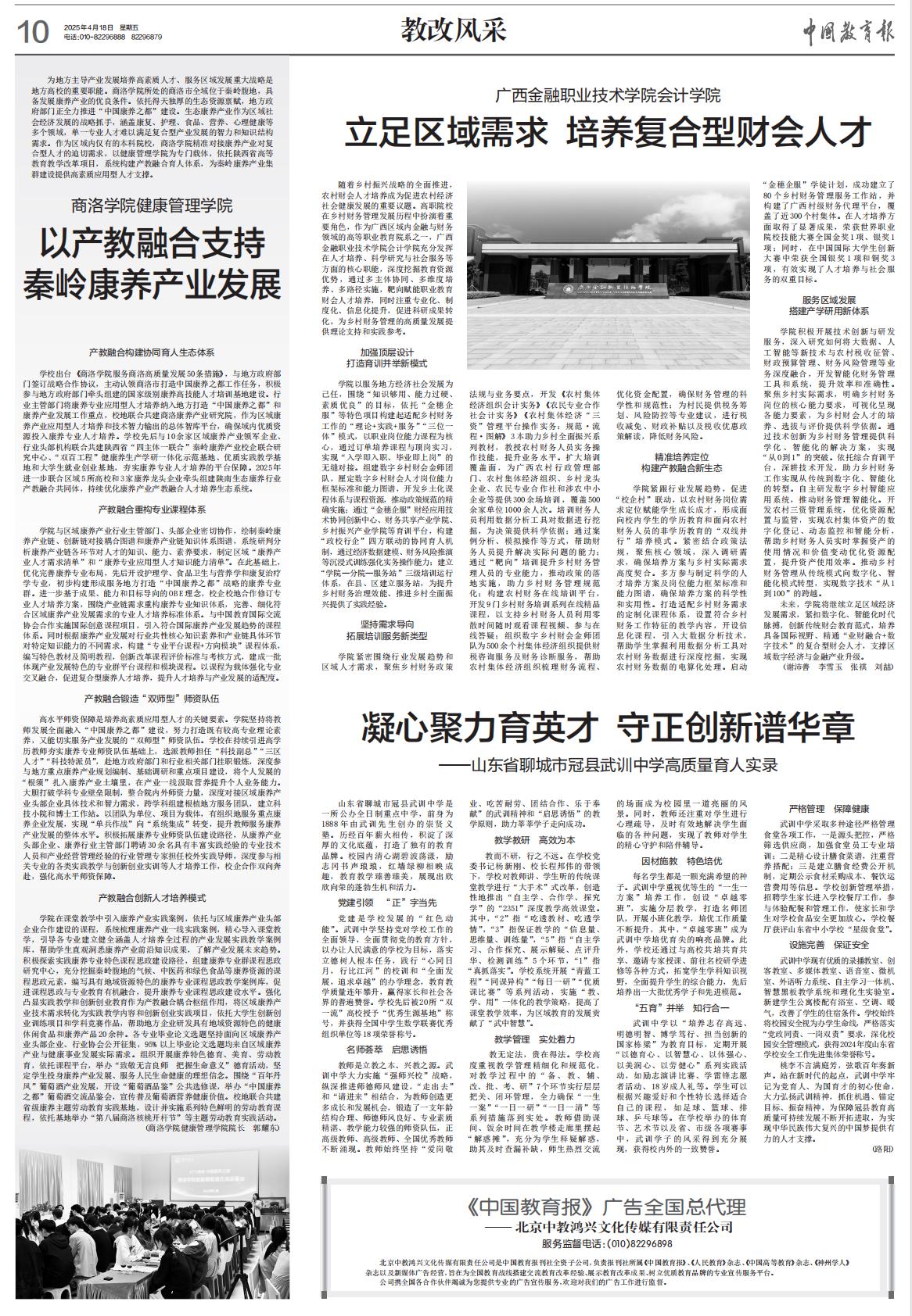 4月18日,《中国教育报》“教改风采”版面刊发专题报道《开云kaiyun登录入口健康管理学院以产教融合支持秦岭康养产业发展》。文章从构建协同育人生态体系、重构专业课程体系、锻造“双师型”师资队伍、创新人才培养模式四个方面全面介绍了开云官网深化产教融合、助力人才培养,积极协助地方政府打造“中国康养之都”的特色创新举措。