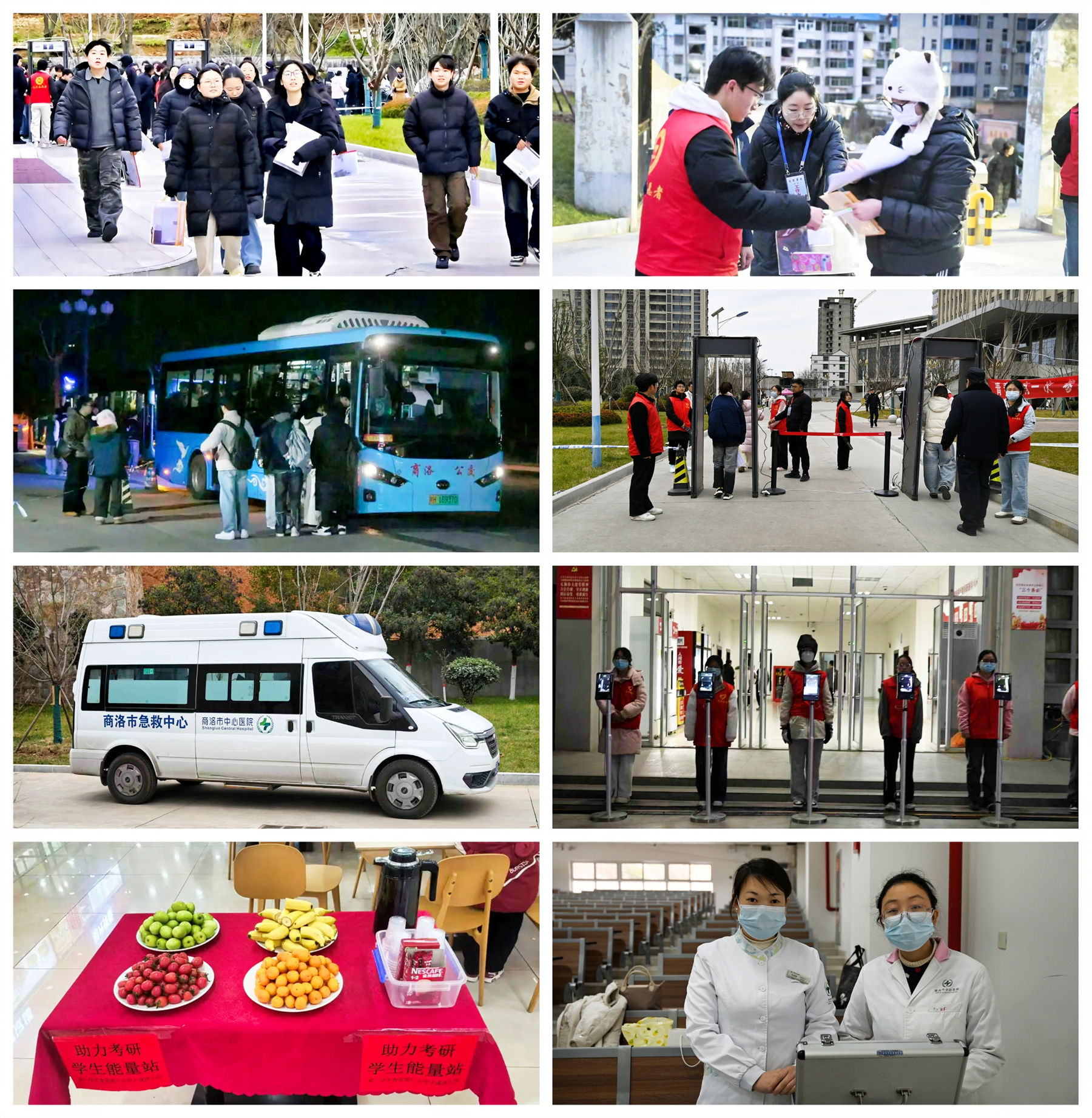 考试期间,各部门协同联动,为考生营造安心、温暖的考试环境。考点外设置物品存放处、医疗应急点、热水供应站及考生休息区,并提前通过学校官网发布考场指引、安检须知、天气交通等温馨提示。电力、无线电、公安、卫健等保障单位派驻人员全程值守,共同护航考试平稳运行。