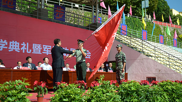 校党委书记龙治刚为2017级学生军训团授予团旗,马防代表学生军训团接旗。