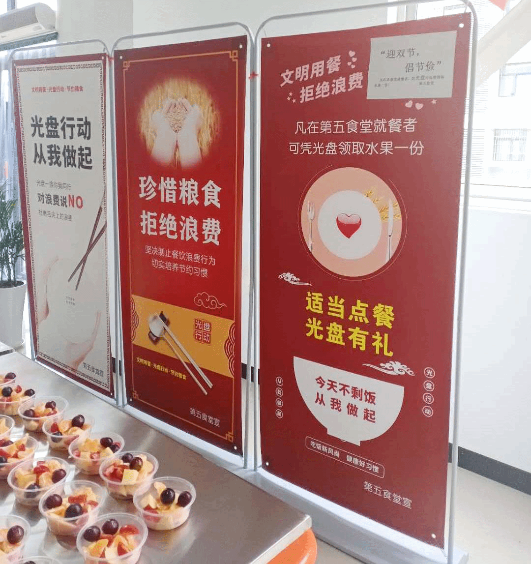 ——加强宣传力度,营造浓厚氛围。充分利用横幅标语、海报挂图、公告栏和微信公众号等媒介,多种形式宣传制止餐饮浪费,让节约教育在全校食堂随处可见,着力引导广大师生培养健康文明的餐饮文化和勤俭节约的良好道德风尚。以开学为契机,把勤俭节约教育融入到文明就餐、光盘行动等活动中,引导学生树立正确的世界观、人生观、价值观。加强先进典型的正面宣传,发挥榜样示范作用,对浪费行为开展反面警示教育,加大对浪费行为的纠正力度。