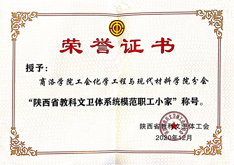 近日,陕西省教科文卫体工会委员会发布了《关于表彰陕西省教科文卫体系统模范职工之家、模范职工小家、优秀工会工作者、优秀工会积极分子、优秀工会之友的通报》(陕教科文卫体工字[2020]46号),校工会化材学院分会被授予陕西省科教文卫体系统“模范职工小家”荣誉称号。
