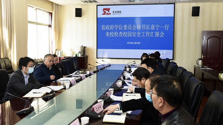 根据陕西省委教育工委、省教育厅校园安全专项整顿工作安排,11月10日上午,陕西省政府学位委员会秘书长袁宁,省教育厅研究生处处长张和平、干部成鹏一行3人来到开云官网,开展校园安全专项检查工作。校长范新会主持召开工作汇报会。党委副书记彭虎军、副校长王新军出席汇报会并陪同检查。党委办公室·院长办公室、宣传部、人事处、学生处、教务处、保卫处、资产管理处、后勤保障处、信息化建设与管理处相关负责人参加会议。