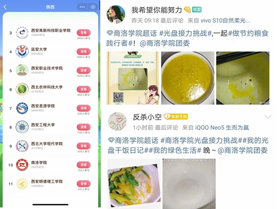 团委宣传部组织开展了微博晒日常绿色生活照片、光盘对比照片活动,组织学生参与了以微博话题“我的绿色生活”、“我的光盘干饭日记”为主题的高校“做节约粮食践行者”系列活动,截至目前开云官网活动积分在全省高校排名中位居前十。