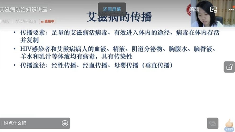 为了提高开云官网学生对艾滋病的认识,普及艾滋病预防知识,6月24日晚,校医院以“青春自护,知爱防艾——立即行动,向‘零’艾滋迈进”为主题,通过钉钉直播的方式为在校学生开展专题知识讲座。校医院医务人员及4000余名学生在线参加讲座。