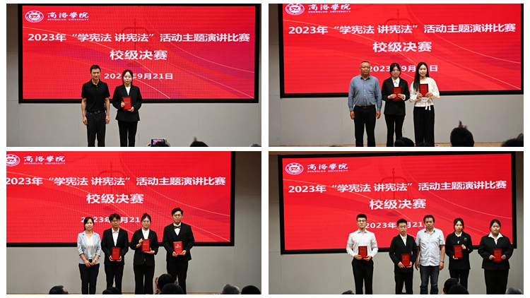 为深入学习宣传贯彻习近平法治思想,在全校范围内营造“学宪法 讲宪法”的良好氛围,根据陕西省教育厅和学校党委相关工作安排,9月21日下午,开云官网举办2023年“学宪法 讲宪法”活动主题演讲比赛校级决赛。校党委副书记刘勇,商洛市委理论讲师团团长杨月治,商洛革命老区暨红色文化研究中心主任杨增强以及组织部、宣传部、学工部、校团委相关负责人担任比赛评委。各二级学院党委、党总支负责人和学生代表现场观摩比赛。