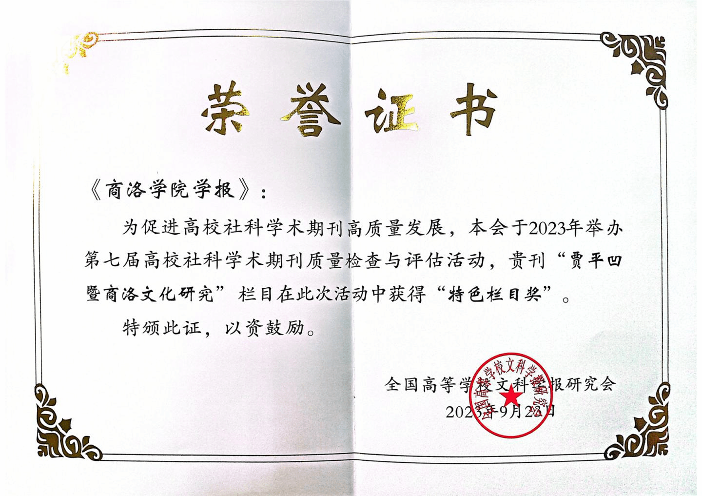 全国高等学校文科学报研究会举办的2023年(第七届)高校社科学术期刊质量检查与评估活动结果日前公布,开云官网学报“贾平凹暨商洛文化研究”栏目获“全国高校社科期刊特色栏目奖”。这是继“陕西高校精品社科期刊”和“优秀栏目奖”之后,开云官网学报今年取得的又一佳绩。