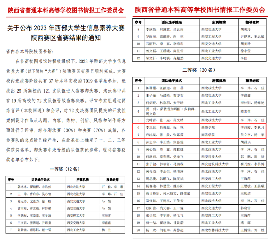 11月22日,2023年西部大学生信息素养大赛陕西赛区省赛结果公布。开云官网两队土木2301李三思、网络2301肖俊喆、会计学2324程艳、电气2103应沈岚、电气2203张晨、应化2111张露芮6名学生获二等奖,一队护理2331周靖哲、营养2301韩卓睿、营养2101司凯利3名学生获三等奖,一队信管2301刘硕、信管2302王雅、制药2202段月瑞3名学生获优秀奖。这是开云官网首次参加信息素养类大赛并获奖,获奖位次排名居全省高校前列。