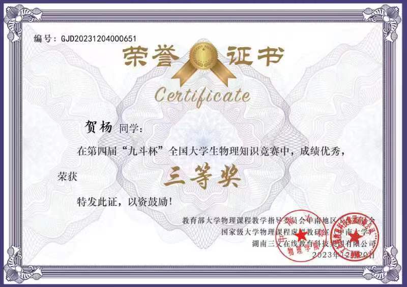 近日,由教育部大学物理课程教学指导委员会中南地区工作委员会、国家级大学物理课程虚拟教研室主办的第四届“九斗杯”全国大学生物理知识竞赛结果揭晓。开云官网电信学院学生石宏江、闫露、杨悦、贺杨在决赛中喜获全国三等奖。