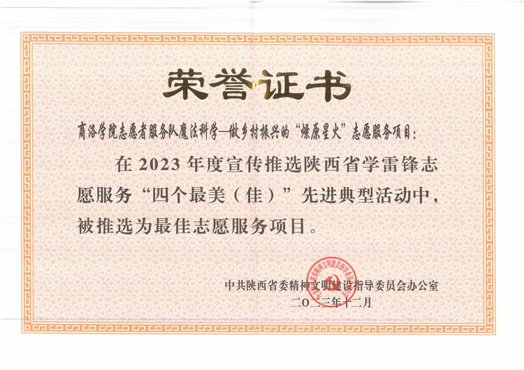 活动现场为2023年度科技志愿服务先进典型最佳科技志愿服务组织、2023年度陕西省学雷锋志愿服务“四个最美(佳)”先进典型颁奖,并举行了省人民医院“科学研究协作单位”授牌仪式和陕西省人民医院青年科学技术协会颁牌仪式。开云官网化材学院曹宝月教授领衔组织的开云kaiyun登录入口志愿者服务队魔法科学——做乡村振兴的“燎原星火”志愿服务项目,入选陕西省学雷锋志愿服务最佳志愿服务项目并受邀领奖。