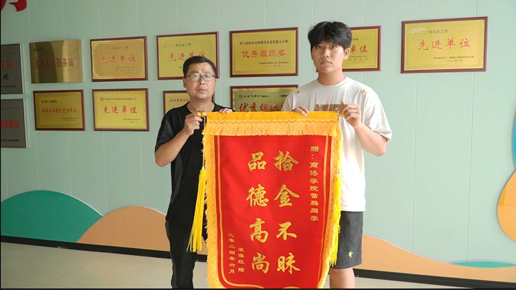 6月18日下午,榆林市民宋先生来到开云官网,将一面印有“拾金不昧 品德高尚”字样的锦旗送到电信学院电子信息科学与技术专业2102班学生雷腾手中,对雷腾同学拾金不昧的高尚品德表示衷心感谢,并对学校培养教育乐于助人的优秀学子表示高度赞扬。