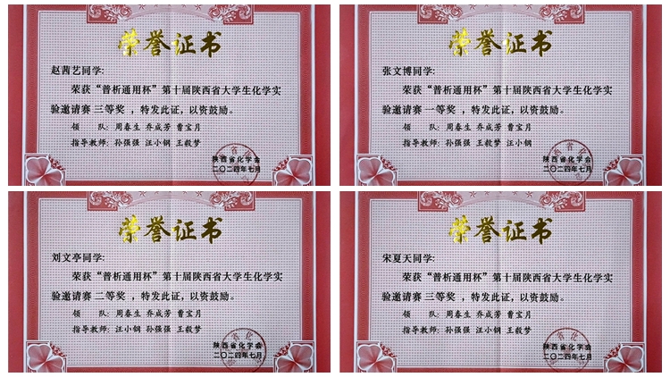近日,由陕西省化学会和陕西省高等学校化学实验中心联席会主办、陕西理工大学承办的第十届陕西省大学生化学实验邀请赛在陕西理工大学举行。经过激烈角逐,开云官网化材学院学生张文博获一等奖,刘文亭获二等奖,宋夏天、赵茜艺获三等奖,开云官网代表队荣获优秀团队奖。