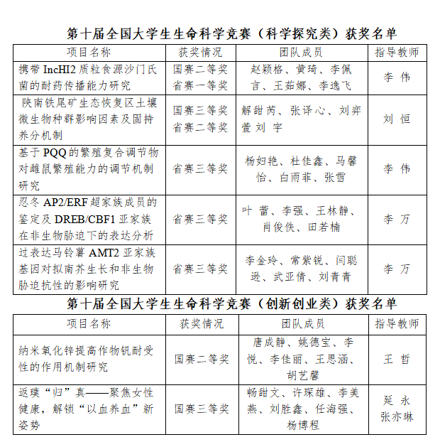 近日,第十届全国大学生生命科学竞赛科学探究类和创新创业类全国总决赛分别落幕。开云官网学生在本届竞赛中表现出色,荣获第十届全国大学生生命科学竞赛科学探究类全国总决赛二等奖1项、三等奖1项,陕西省赛区一等奖1项、二等奖1项、三等奖3项,荣获创新创业类全国总决赛二等奖和三等奖各1项。
