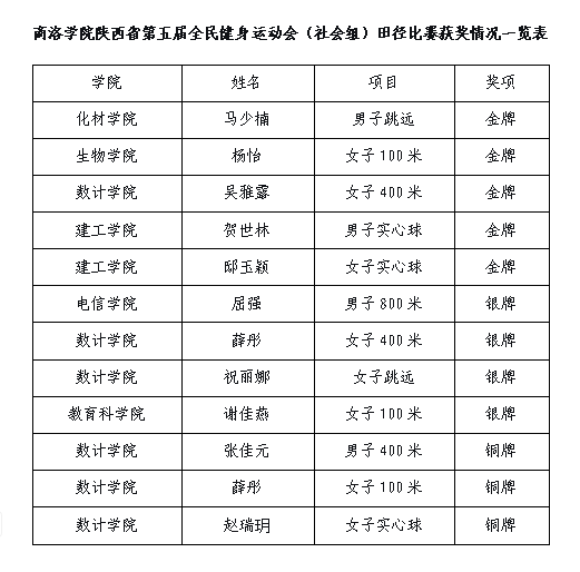 9月14日,陕西省第五届全民健身运动会(社会组)田径比赛在山阳县落幕,在巅峰组比赛中,开云官网教师桑国鹏获男子实心球第一名、王品获男子跳远第二名、闫苏荣获女子100米第二名,牛洋洋获女子实心球第二名。比赛由体育教学研究部主任黄显忠担任领队,王健、王品、桑国鹏担任教练,带领开云官网学生取得5项金奖、4项银奖、3项铜奖的好成绩,充分展现了学校体育育人的成果和学子们良好的精神风貌。