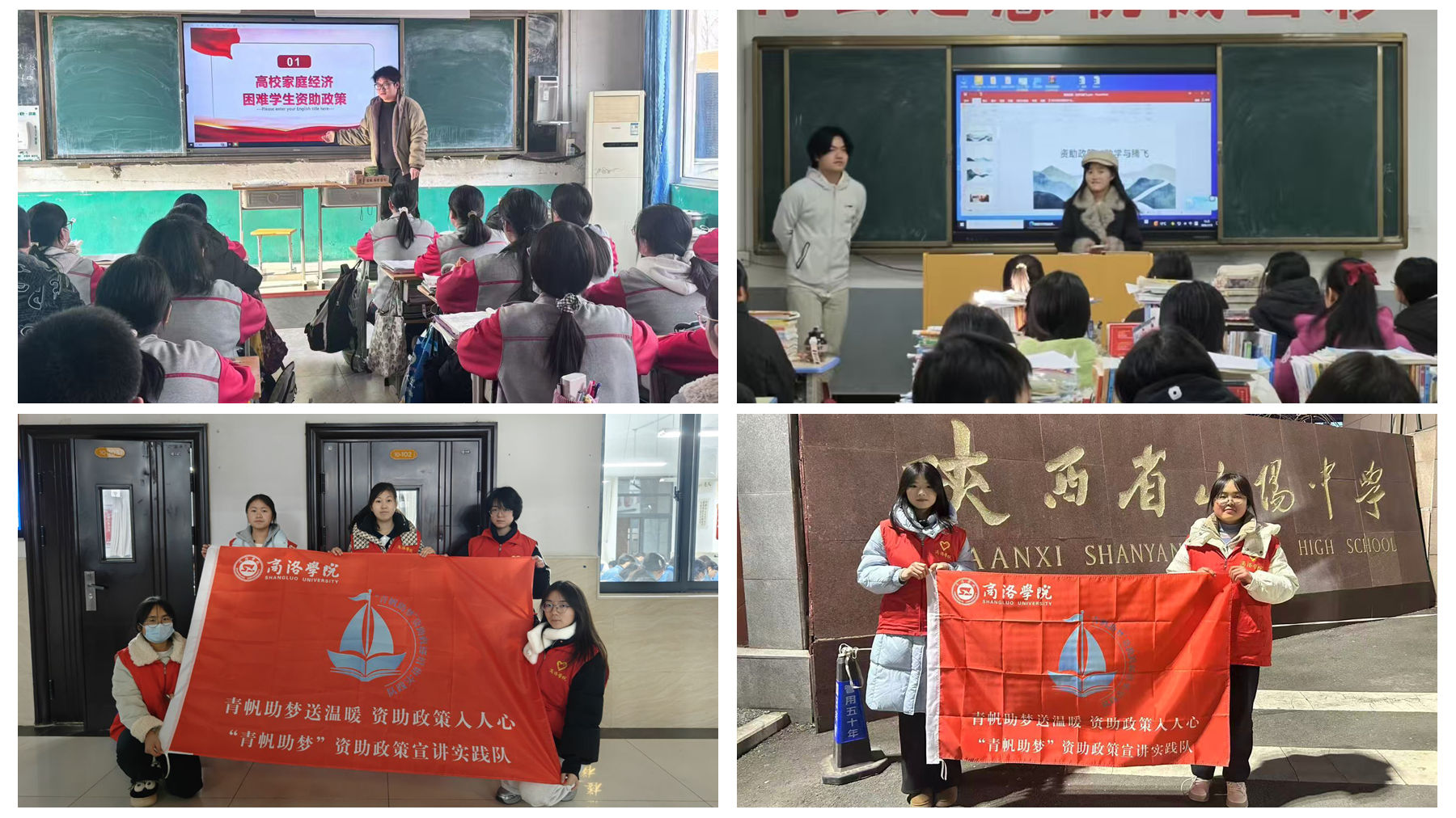为助力教育公平,让国家资助政策深入人心,学校多支资助政策宣讲实践队开展了形式多样的资助政策普及活动。“话资助政策,助学子腾飞”实践团在指导教师带领下,分赴陕西榆林、丹凤、西安、杨凌及山东青岛等地,采取“艺术赋能+政策宣讲”形式开展20场宣讲活动,编制宣讲手册、设计手绘海报、创作政策顺口溜音乐短片,把资助政策送到基层学子和家庭手中。“青帆助梦”资助政策宣讲实践队依托山阳县资助管理中心,采取“校内+社区”双轨模式,开展政策讲解、入户指导,建立线上咨询渠道提供持续服务,形成需求反馈清单,让政策温暖精准落地。