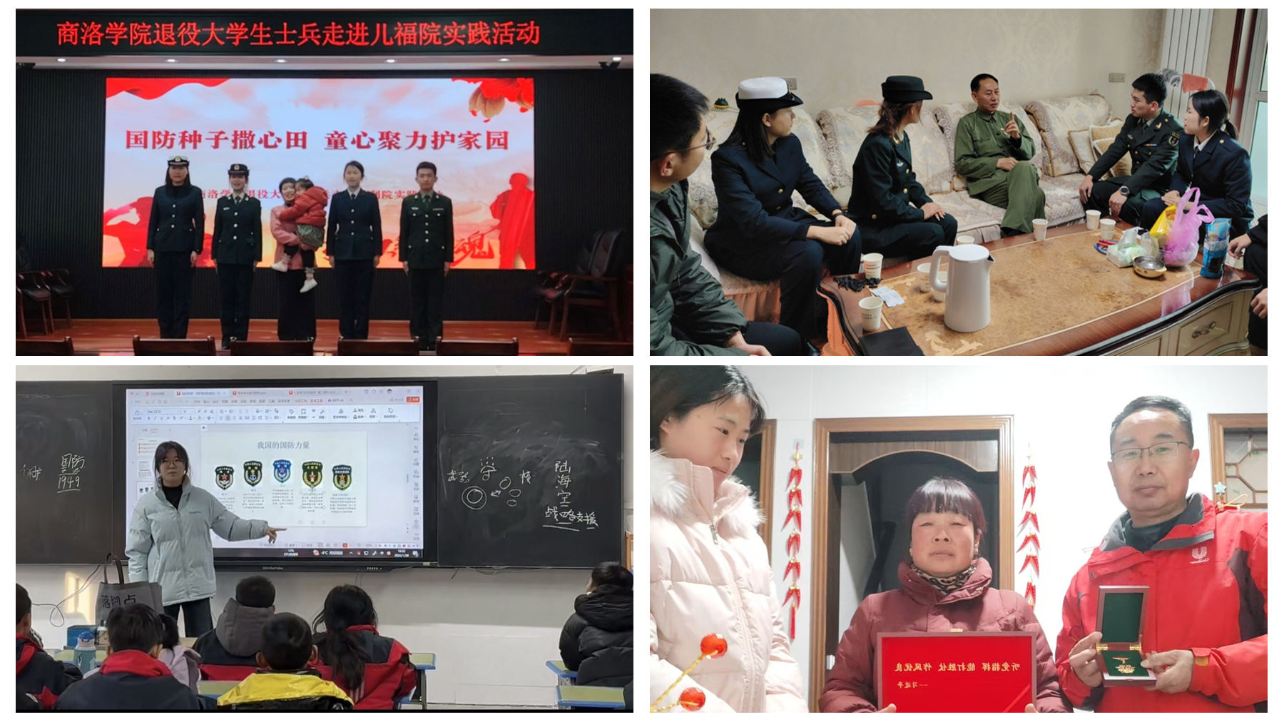 由退役大学生士兵和志愿者组成的“暖冬志愿行,青春护国防”实践团,发挥“朋辈引领”作用,通过政策咨询、图文展览、军旅故事分享、寻访老兵等形式,让国防知识走进群众生活。“逐光”国防教育实践团创新“调研-宣讲-寻访-传播”四位一体模式,深入基层系统完成《公众国防意识调研报告》,并走进城关小学开展国防知识进校园活动,邀请专家与退役大学生士兵开展讲座,通过趣味问答、装备模型展示等互动,在青少年心中种下爱国爱军的种子。