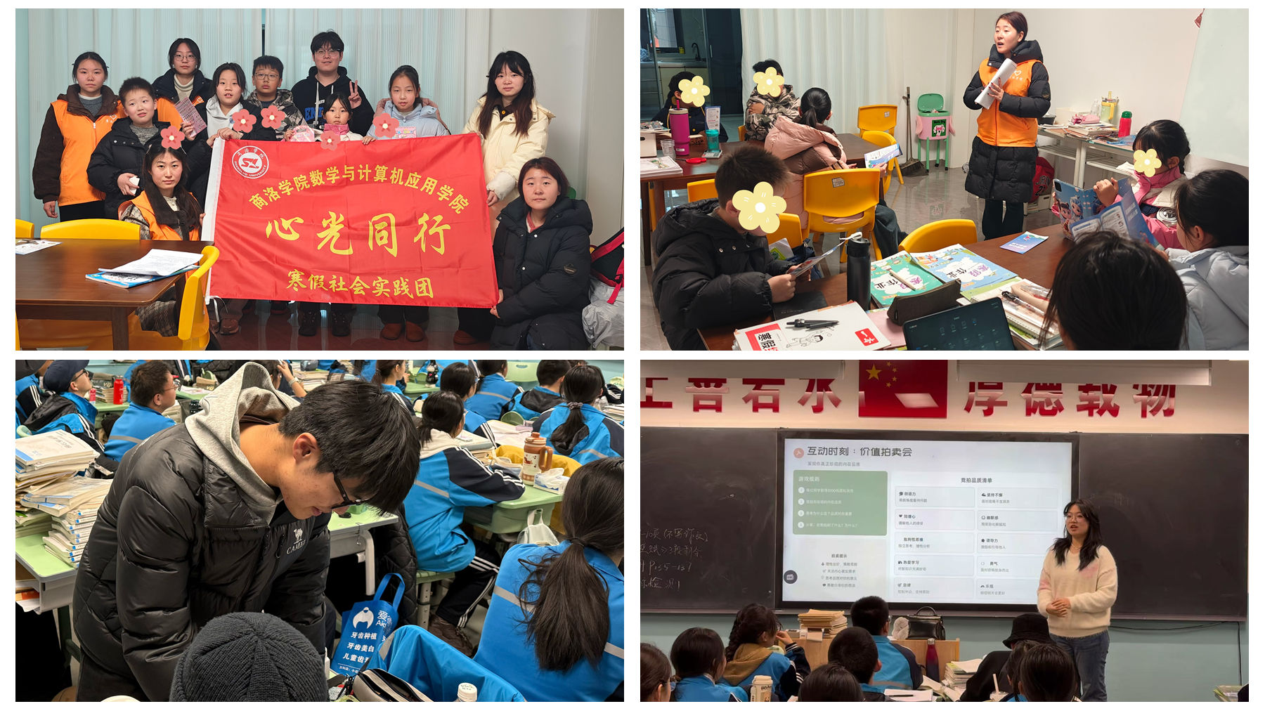 多支实践团队聚焦青少年心理健康需求,开展精准化心理育人实践。“心光同行”实践团奔赴延安安塞及商洛商州、丹凤等6个县区,围绕自我认知、同伴沟通等内容,通过“情绪蹲”“人际盲盒”等趣味游戏引导青少年识别情绪,并提供一对一心理疏导服务。心语宣讲团赴山西太原三十中开展宣讲,讲解各类情绪调节技巧,通过“价值拍卖会”“青春树洞”等环节解答学业平衡、考前焦虑等成长困惑。青春心灵护航实践团赴丹凤县职业教育中心开展心理辅导,通过呼吸放松训练、“优点轰炸” 等互动形式,帮助学弟学妹掌握心理调适方法。