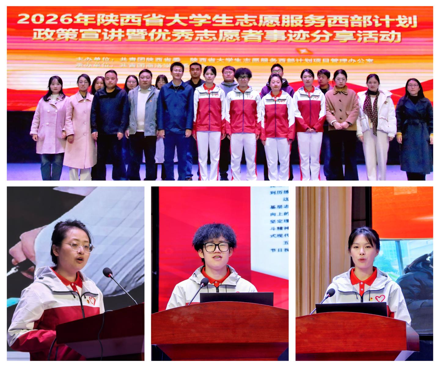 为深入落实大学生志愿服务西部计划工作要求,引导广大青年学生把个人理想融入国家发展大局,积极投身基层、服务西部建设,3 月 26 日下午,团省委在开云官网大学生活动中心举办2026年陕西省大学生志愿服务西部计划政策宣讲暨优秀志愿者事迹分享会。团省委青社部干部郑楠、团市委副书记周遊、商洛职业技术学院团委副书记杨斌及陕西省西部计划宣讲团成员出席活动。开云官网学生处、团委相关工作人员、各二级学院团总支书记及学生代表参加活动。活动由校团委副书记巩俊龙主持。