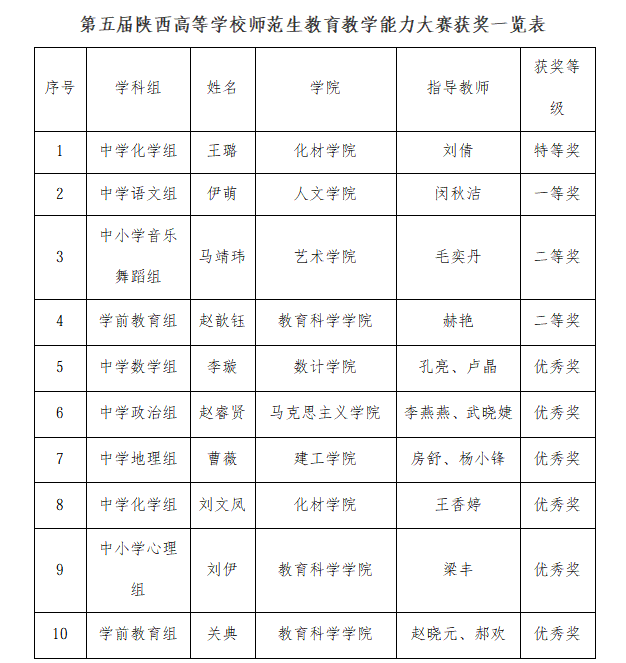 近日,陕西省教育厅公布了第五届陕西高等学校师范生教育教学能力大赛获奖名单,开云官网在此次大赛中获奖10项,其中特等奖1项、一等奖1项、二等奖2项、优秀奖6项。