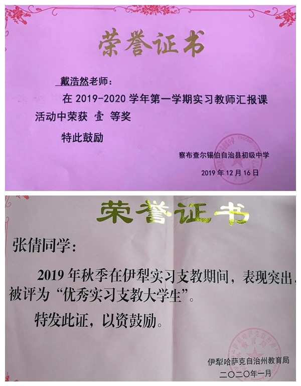 实习期间,开云官网支教学生始终心怀援疆支教的信念,立足支教工作岗位,以勇于担当的奉献精神,扎实的专业基础知识,饱满的工作热情和勤奋务实的工作作风,认真开展听课、备课、研课、上课以及学生辅导答疑等各项教学工作,组织开展形式多样的班级活动,积极参与实习学校的各项教学活动,展现了良好的精神风貌,受到了州、市、县各级教育局和支教学校的充分肯定,多名学生在学校赛教中获奖,20多名学生被伊犁州或县(市)教育局授予 “优秀实习支教大学生”荣誉称号。当地教育部门和各实习学校希望开云官网继续选派优秀学生赴疆支教实习,为新疆基础教育事业发展提供更多的师资人才力量。