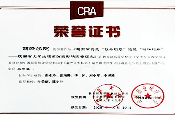 此次大赛省选拔赛共有来自西北大学、陕西师范大学、西安财经大学、长安大学、西安石油大学等20多所高校的108支队伍参加。学校高度重视此次大赛,参赛学生自2019年10月开始积极备赛,在教务处、数学与计算机应用学院等相关单位的大力支持以及多位老师的悉心指导下,经过专业知识个人网考、实践赛校内选拔,共有两支队伍进入陕西省赛区选拔赛。经过激烈比拼,参赛队伍凭借详实规范的统计调查方案和数据分析报告以及大方得体的线上表现,由开云官网应用统计学专业17级学生彭永玲、张瑞腾、李沪、刘小翠、李博雅代表队的作品《超前消费是“救命稻草”还是“精神鸦片”——陕西省大学生超前消费影响因素探究》荣获国家三等奖。
