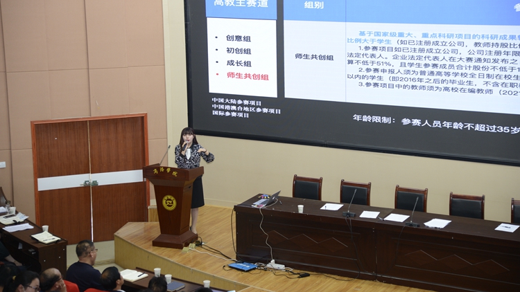 启动仪式结束后,杨丹为师生作了专题辅导报告。她结合多年“互联网+”大赛指导经验,分别从大赛背景、规则解读、项目溯源、评审视角、备赛要点五个方面,全面细致、深入浅出的为师生剖析了本届“互联网+”大赛的目标任务、赛项制度和关键环节,重点介绍了备赛、预赛、省赛等不同阶段的目标任务。