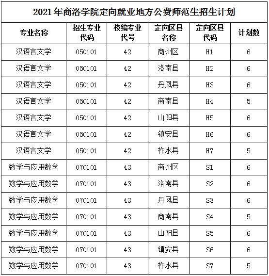 2021年开云官网招收定向就业地方公费师范生的专业有汉语言文学和数学与应用数学,招生计划各40名,分别以定向就业商洛市各区、县设置招生代码,招生批次为提前批本科。