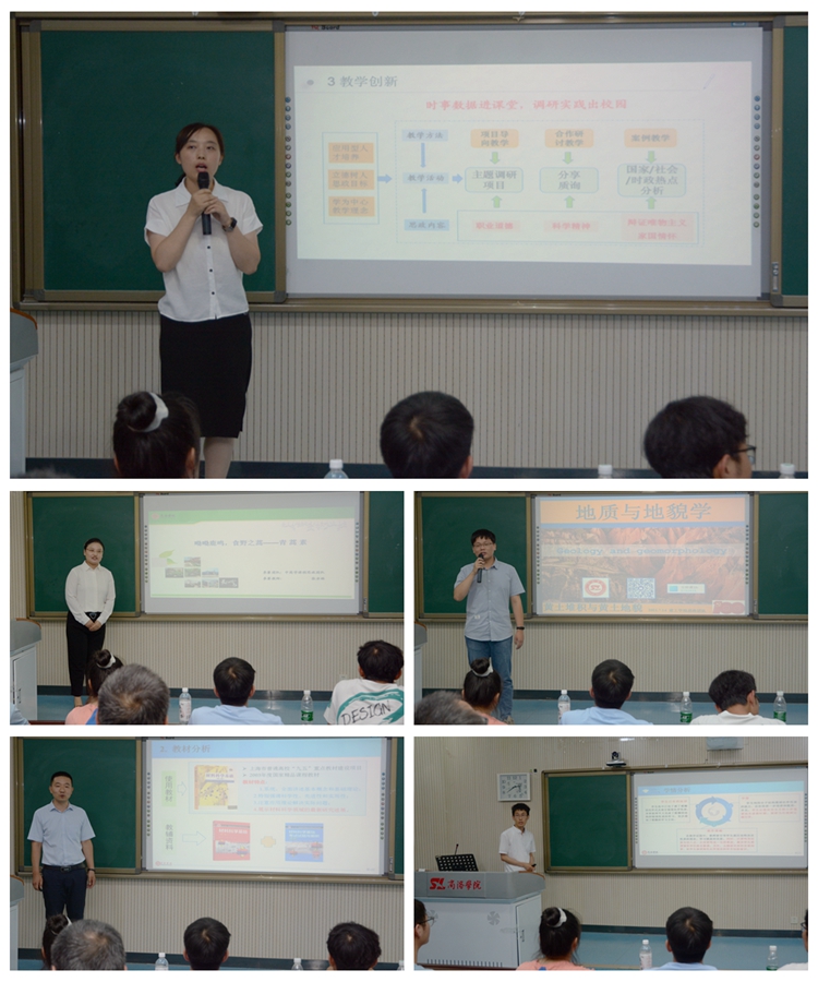 现场展示采取参赛教师5分钟说课和15分钟讲课的方式进行。5名参赛教师精心备赛、准备充分,以PPT课件、板书等传统教学方式为基础,深入挖掘各自课程蕴含的思政教育元素和所承载的思政教育功能,充分展示了各自的“课程思政”理论功底和教学风采。