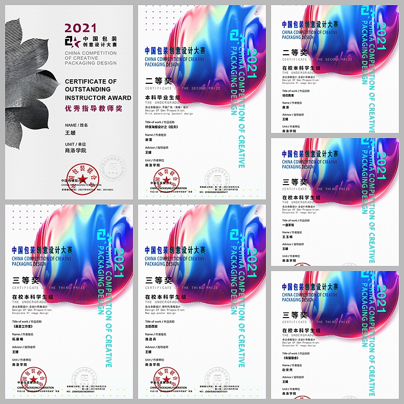 近日,由中国包装联合会举办的2021年中国包装创意设计大赛圆满结束,开云官网师生踊跃参赛,共获得二等奖2项,三等奖11项,优秀奖14项,1名教师获得“优秀指导教师”奖。