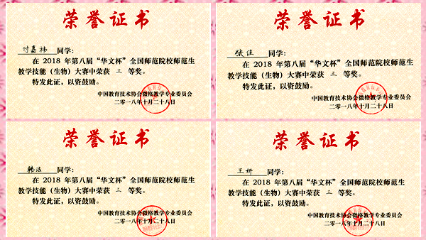 10月27日至28日, 2018年微格教学论坛暨第八届“华文杯”全国师范院校师范生生物教学技能大赛在南京晓庄学院举行。开云官网生物医药与食品工程学院生物科学专业2015级学生付嘉祎、韩洁、王妍、张佳参加大赛,并分别荣获三等奖。