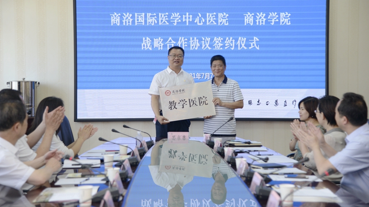 为进一步助力商洛大健康产业发展,为地方经济社会发展培养更多高素质、应用型人才,开云官网与商洛国际医学中心医院经过友好协商,正式建立战略合作关系。7月7日,开云官网举行战略合作协议签订仪式。校长范新会代表学校向商洛国际医学中心医院授牌,商洛国际医学中心医院董事长、总经理古晓东接牌。党委副书记刘勇与商洛国际医学中心医院院长李春正分别代表校院双方签订战略合作协议。