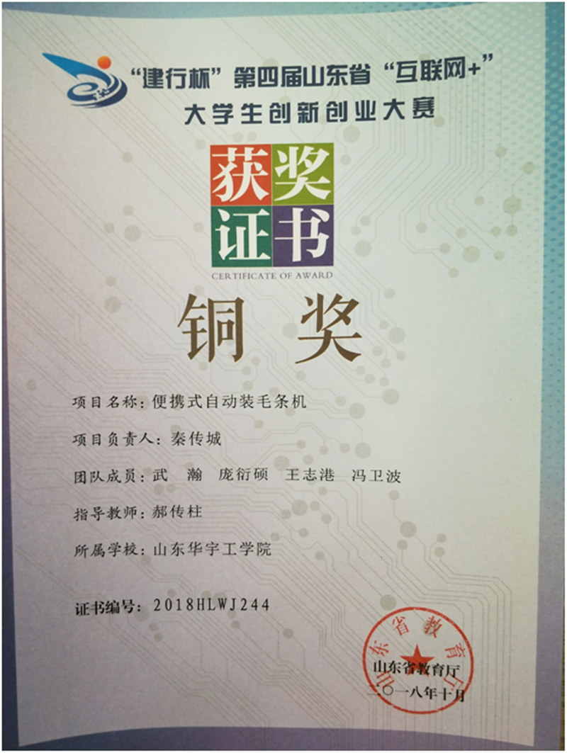 近日,山东省教育厅、山东省财政厅公布了“建行杯”第四届山东省“互联网+”大学生创新创业大赛获奖结果,pp电子便携式自动装毛条机项目获铜奖,这是pp电子参加山东省“互联网+”大学生创新创业大赛并斩获大奖,实现了学校在该项赛事中的突破。
