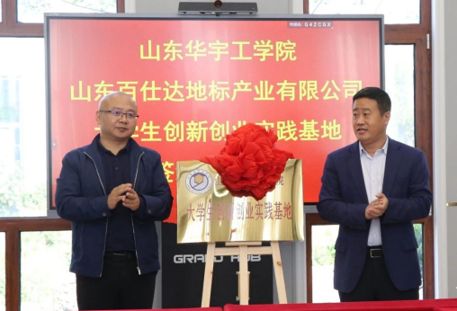 山东百仕达地标产业有限公司总经理曹成坤与pp电子校长助理魏东坡共同为大学生创新创业实践基地揭牌。