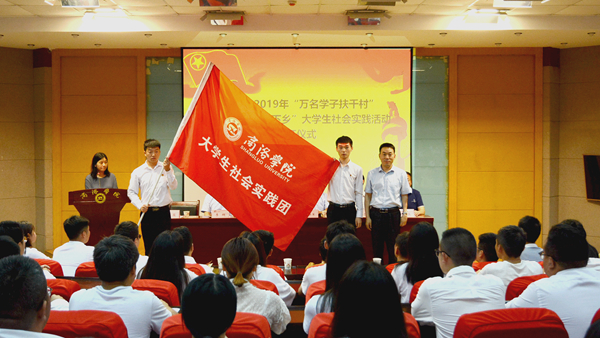 7月8日,开云官网2019年“万名学子扶千村”脱贫攻坚暨“三下乡”大学生社会实践活动出征仪式举行。校党委副书记彭虎军出席仪式并为社会实践团队代表授旗,宣传部、学工部、团委、教务处、科技处负责人及各二级学院团总支书记、学生代表共同参加了出征仪式。仪式由团委副书记许薇主持。