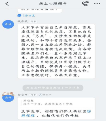 辅导会开展过程中,学生们积极参与讨论,很多学生表示“超级超级想去学校”“只想去上学”,当然学生们也会担忧自己回学校就被隔离了,担心因为自己是湖北人而受到大家的异样眼光。辅导老师针对学生的这些焦虑、恐惧等负性情绪进行了线上辅导,学生们表示“相信咱们的母校、相信咱们伟大的祖国”。