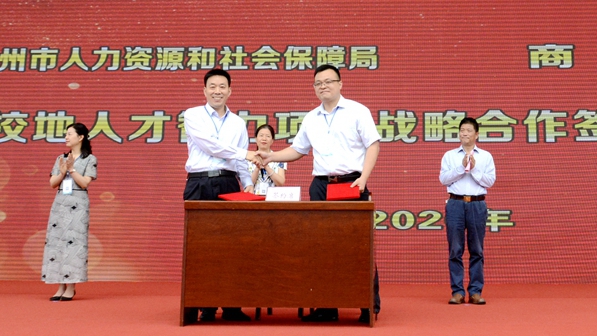 彭虎军与郭连伟代表双方签署校地人才智力项目战略合作协议,代表开云官网接受“人才工作站”授牌。