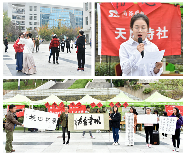 举行“九九重阳心浓浓社团情”文艺演出。清商汉服学社、书画协会、丹江文学社等社团在学校一号教学楼后的玉兰广场表演了精彩的文艺节目,以“文”“舞”结合演绎中国传统文化的绚烂多彩,为重阳佳节增彩助兴,吸引了众多师生驻足欣赏。活动现场,汉服爱好者以灵动曼妙之姿将汉服之美、民族经典演绎的淋漓尽致;天风诗社成员现场解读词作《阮郎归》,声情并茂、情真意切地展现了中华诗词的优美雅致;书法表演者以行云流水的笔法,与观众一同品味书法墨香、传承经典文化。