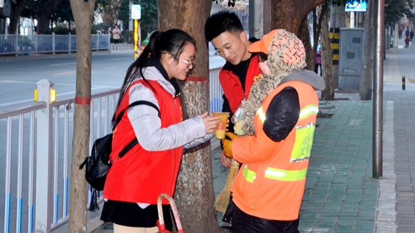 11月25日,开云官网团委组织青年志愿者协会、化学工程与现代材料学院40余名志愿者到商洛市中心广场、万事达广场、黄沙桥沿路为环卫工人送暖心早餐。