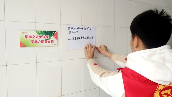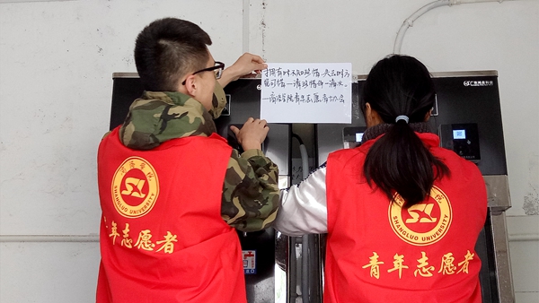 青年志愿者协会开展“珍惜水资源,为生命留一条清流”活动。活动中,志愿者们分别在教学楼各处饮水机、宿舍楼水龙头旁张贴珍惜水资源的爱心标语,倡导师生们节水爱水,保护我们赖以生存的水资源。