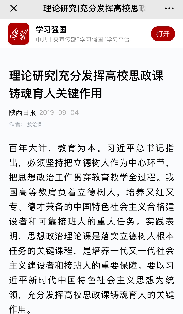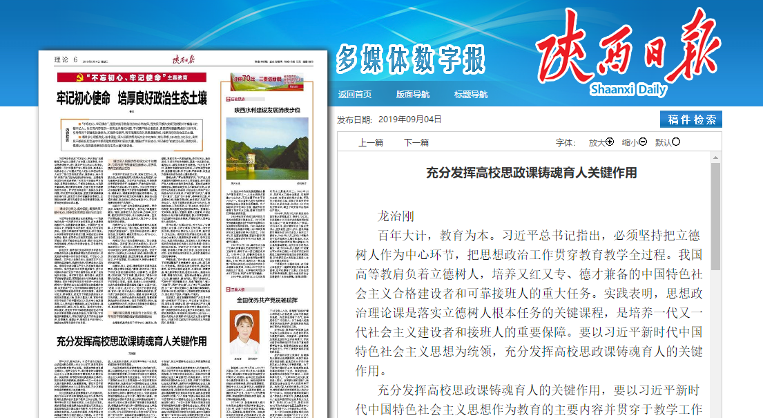 党委书记龙治刚在《陕西日报》2019年9月4日第6版发表理论文章《充分发挥高校思政课铸魂育人关键作用》,学习强国平台全文转载。文章内容如下: