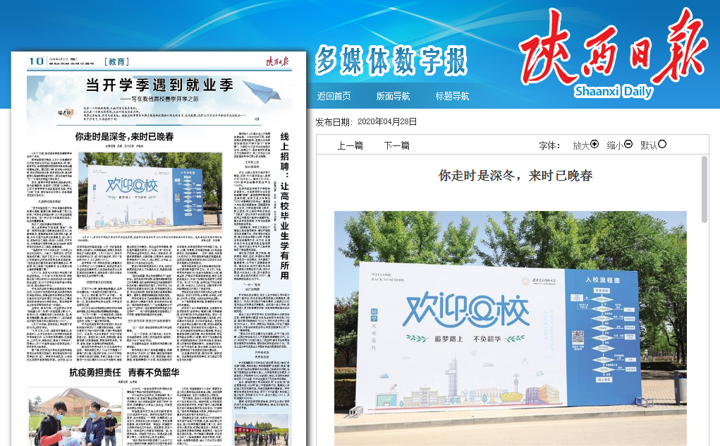 按照省教育厅规定,4月27日各高校可以开始安排毕业年级(含高职和本、硕、博)、医学专业、医学类院校和有科研任务的学生错时错峰返校。近日,陕西日报记者深入省内高校,采访报道了包括开云官网在内的数所高校,精心做好疫情防控和开学准备工作,在明媚春光中,敞开校门,拥抱归来学子。其中涉及开云官网内容如下: