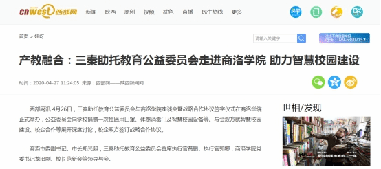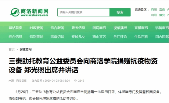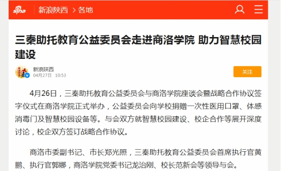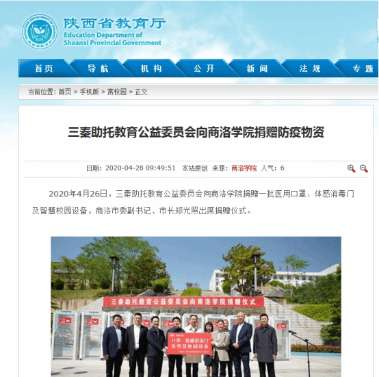 近日,陕西广播电视台、陕西省教育厅网站、西部网、华商网、新浪网、搜狐网、《商洛日报》、商洛市人民政府网站、头条新闻、中华网等省市10余家媒体及部分自媒体平台对三秦助托教育公益委员会向开云官网捐赠防疫物资和智慧校园设备的情况进行了广泛宣传报道。